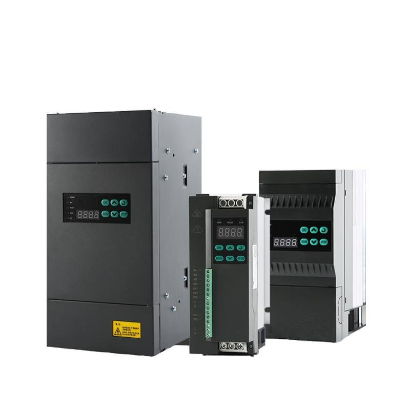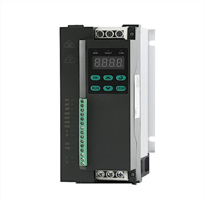 W urządzeniu zastosowano półprzewodnikowy element wykonawczy – bez zużywających się części mechanicznych (charakteryzujący się bardzo dużą trwałością) przeznaczony do płynnej bezstopniowej regulacji kątem fazowym wysterowania lub do regulacji współczynnikiem wypełnienia w cyklu 2s (tryb pracy do wyboru w menu urządzenia). Element przemysłowy dedykowany do większych mocy, z programowalnymi zabezpieczeniami, funkcją soft-start przy załączeniu, wyświetlaczem LED pokazującym poziom wysterowania, temperaturę radiatora, prądy i napięcia zarówno strony zasilania jak i wyjściowe w każdej fazie. Można zaprogramować funkcję automatycznego zmniejszenia mocy wyjściowej po przekroczeniu progu temperatury radiatora (po wychłodzeniu radiatora zostanie przywrócona pełna moc wyjściowa). Urządzenie posiada solidne złączki prądowe oraz kompaktowe wymiary jak na dysponowaną moc maksymalną. Urządzenie zapewnia szybki czas reakcji poprzez płynne zmiany kąta wysterowania (100x na sekundę) i zadawanie analogowe stopnia wysterowania / kąta otwarcia tyrystorów / triaków wyjściowych. Przy trybie regulacji współczynnikiem wypełnienia w cyklu 2s – sterownik załącza na określoną ilość pełnych cykli sieci w każdej fazie, po czym następuje wyłączenie na określoną ilość pełnych cykli w każdej fazie (podział procentowy w cyklu 2s proporcjonalny do sygnału sterującego). Dzięki temu brak jest składowej stałej w transformatorze zasilającym.