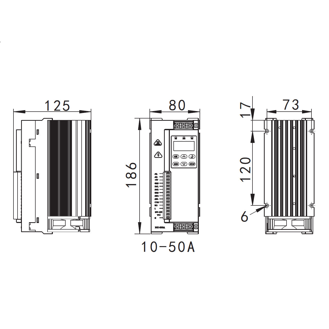 Przemysłowy programowalny półprzewodnikowy 3-fazowy regulator mocy z zadawaniem analogowym poziomu wysterowania – listwa sterująca uniwersalna z obsługą wybranego sygnału 4-20mA lub 0-5V lub 0-10V DC lub potencjometr 10kOhm lub Modbus RS485. Regulacja mocy odbywa się poprzez regulację kąta fazowego wysterowania łącznika półprzewodnikowego regulowanego SSR / SCR 3-faz. DC-IN / AC-OUT. Prąd maksymalny na fazę (wartość skuteczna bądź RMS) urządzenia wynosi 50A RMS (moc max 38kW przy Umax 440VAC/3-faz / moc nominalna 34kW przy Unom 400VAC / 3-faz).