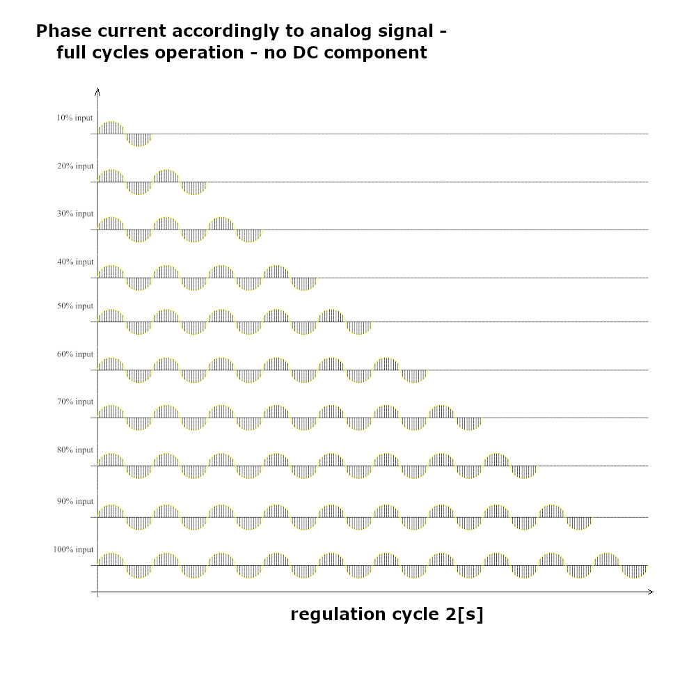 W trybie regulacji współczynnikiem wypełnienia w cyklu 2s – sterownik załącza na określoną ilość pełnych cykli sieci w każdej fazie, po czym następuje wyłączenie na określoną ilość pełnych cykli w każdej fazie (podział procentowy w cyklu 2s proporcjonalny do wejściowego sygnału sterującego). Dzięki temu brak jest składowej stałej w transformatorze zasilającym.